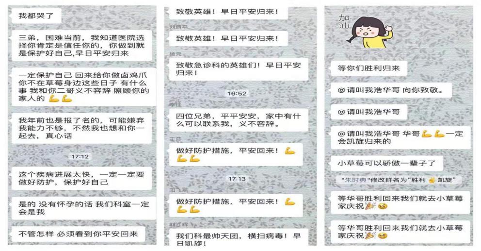 2月7日,元宵节前一晚,中南大学湘雅三医院接到国务院应对新型冠状病毒肺炎疫情联防联控机制(医疗救治组)《关于组派部分委属委管医院医疗队援助湖北应对新型冠状病毒肺炎疫情的函》,短短一个小时,新湘雅急诊护理团队55人连夜向护士长郭美英请战,在最后确定的100名援助湖北白衣战队成员名单中,急诊科就有11位白衣战士走向第一线。一条条请战微信,体现着急诊人救死扶伤、大爱无疆的精神,体现着急诊人若有战,召必应,战必胜的勇气!