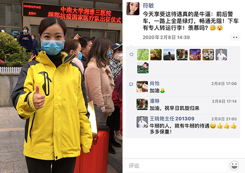 符敏,你是家里的独生女,精致漂亮,泼辣能干,临行前说:“我爸妈还年轻,能照顾好自己,我没什么负担,没关系!但是,他们确实挺担心我的,不过我选择的事情,他们都是无条件支持的,我妈怕我饭菜吃不好,连夜给我做了辣椒萝卜……”。讲到自己爸妈,大大咧咧的你眼里也不禁泛起泪花。大家沉浸在担心、忧虑、牵挂的时候,看看这位长沙妹子发的朋友圈,就知道你的心有多大。
