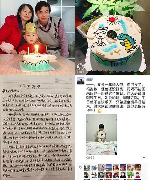丽丽,2月14日是情人节,是你的小情人儿子一一的4岁生日,也是你们驰援武汉的第六天。你说:国难之际,生日不言快乐,待到祖国山河无恙,每天都会快乐。舍小家为大家,家是最小国,国是千万家。你们彰显无私无畏,你们用生命守护生命,用自身健康换取他人健康,万分危险,却无私无畏!不顾个人安危,忘却小家的担忧,挺身而出,义无反顾地投身武汉防控的战场,成为了许多新冠患者的生命守护神。一一宝宝过生日,苗苗阿姨为一一订了最暖心的生日蛋糕,上面有一个卡通的护士妈妈,唇红齿白,笑靥如花;眉眉阿姨买了好吃的水果送到你家里。你放心吧,阿姨要买菜买药我们都送过去了!家里有我们,我们一直都在,你加足马力去战斗,请放心,一定好好保护自己,雄赳赳地去,气昂昂地回来。