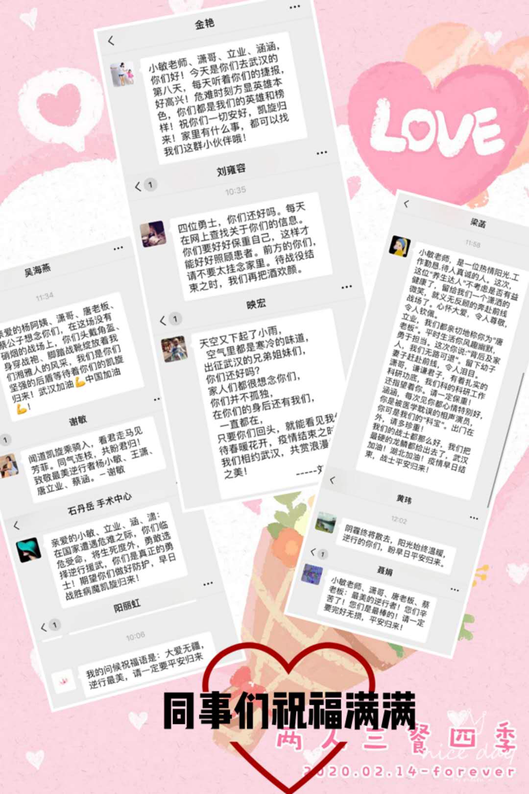 从元宵节开始,手朮中心的杨小敏、唐立业、蔡涵、王潇四位护士加入国家医疗队逆行支援武汉。到今天,已经八天了,大家对他们非常挂念。从战役日记中知道他们很辛苦,防疫压力也大,而今天突然看到他们回复,别提大家多高兴。