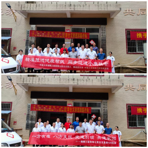 2022年6月,永州江华瑶族自治县遭遇百年一遇的洪涝灾害,自6月6日23时起,暴雨引发的洪水袭击了该县多个乡镇,沿河两岸农作物被淹。“大灾之后有大疫”,江华受灾的消息传到了湘雅三医院,院党委立即启动应急响应。6月27日,医院第七、第九党总支联合选派医生党员,由第九党总支第四党支部书记、教务部主任庄权同志带队,前往江华进行赈灾义诊。
