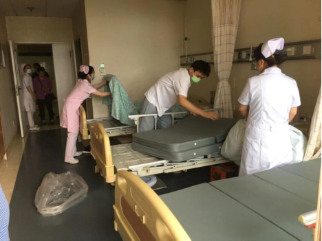 为了不影响临床医疗工作,在护理部、后勤保障部、安全保卫部、财务部等部门的配合与支持下,医学装备部提前和病房预约更换时间,有计划、分批次逐步完成集中更换工作。6月10日晩11时许,第一批床垫抵达医院,安全保卫部提前预留货车通道、停放位置,厂家及医学装备部工作人员连夜组织卸货、暂存等工作;11日上午8时许,厂家及医学装备部共计12人分楼栋分科室组织床垫更换工作,与此同时,医学装备部协调厂家并配合财务部、后勤保障部及时完成旧床垫处置工作。随后,第二批、第三批分别于21日晚、23日晚抵达医院,均于次日完成整体更换工作。