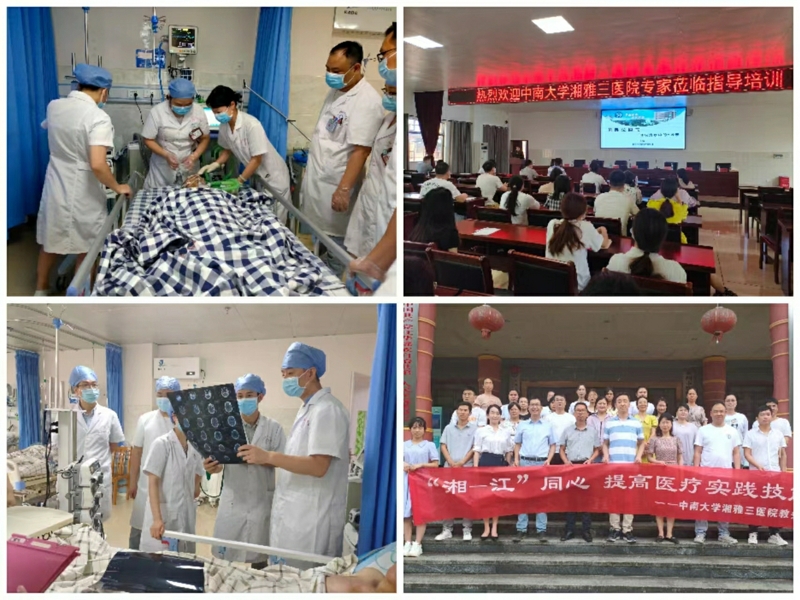 此次帮扶行动便是进行中的一个阶段,由湘雅三医院医务部、教务部牵头,教务部主任庄权带队前往。在江华第一人民医院,由随队的急危重症团队靳欣、岑超群、吴琼分别进行俯卧位通气、消化道出血进展、心肺复苏新进展及相关知识介绍的专题培训讲座,对第一人民医院的医护进行相关培训。讲座后,庄权主任进行教学查房,靳欣医生演示并完成江华第一人民医院第一例“俯卧位通气”治疗示范,将最新的医疗进展进行面对面的传授。在江华人民医院,团队以座谈会的形式对其急危重症中心的发展和教学、科研相关疑惑进行面对面的解答并提出发展建议。