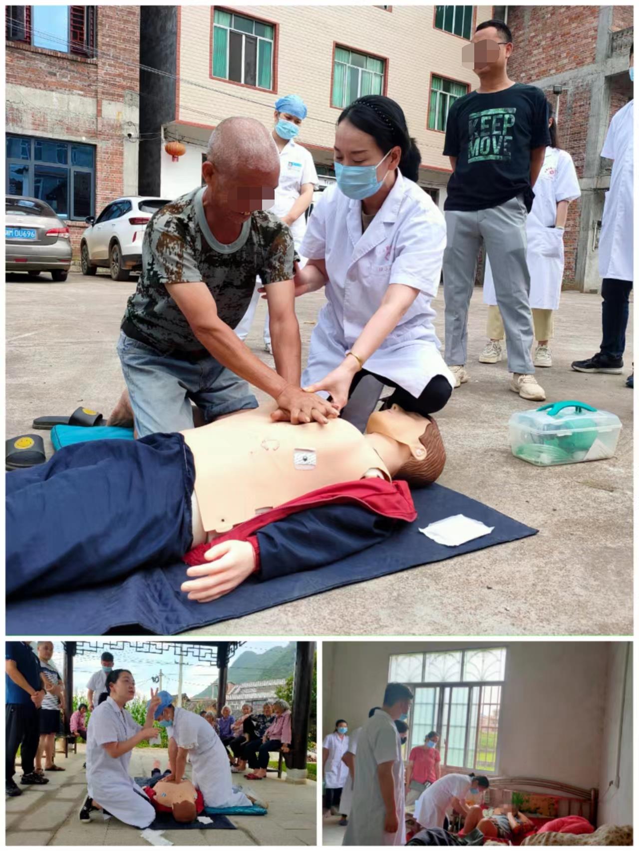 团队还来到水口镇的长山村,对卫生院村医进行技术指导。急诊科吴琼医生现场主持示范对村民进行心肺复苏和海姆利克法的急救普及培训,由当地医护将标准的急救技能传授给民众,让村民遇到健康不良事件时不再手足无措。健康帮扶入户示范则是与村医一同前往家中有病患的农户家中,现场指导并演示对脑梗塞、帕金森、冠心病病人的健康宣教和家庭护理。