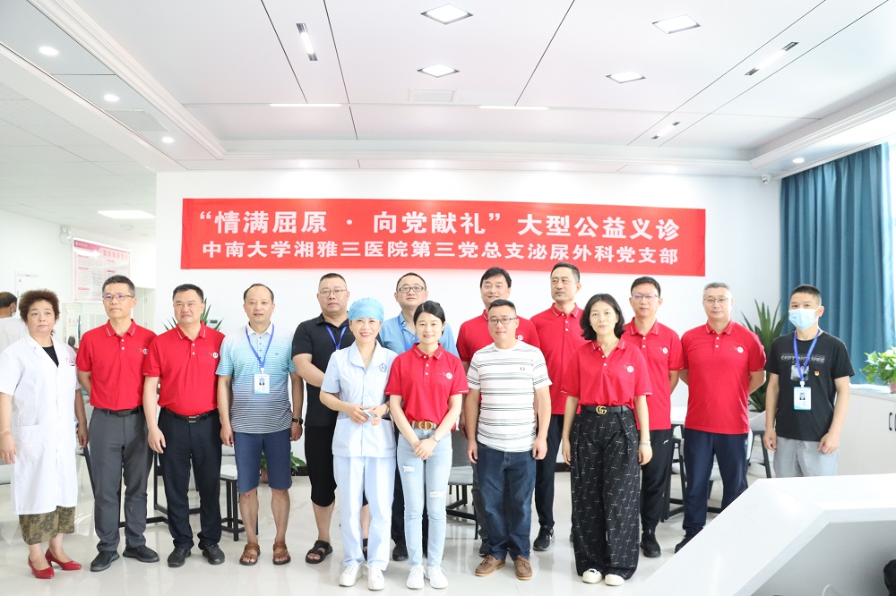 为献礼建党101周年,进一步提升区域辐射带动效应,7月2日上午,中南大学湘雅三医院第三党总支泌尿外科党支部书记、科室主任王龙带领义诊专家团队走进屈原人民医院开展“情满屈原 向党献礼”主题党日大型公益义诊活动。本次活动主要涵盖了专家义诊、针对50岁以上男性开展前列腺癌PSA初步筛查、免费进行泌尿系结石、泌尿小儿等疾病的健康咨询和科普讲座。