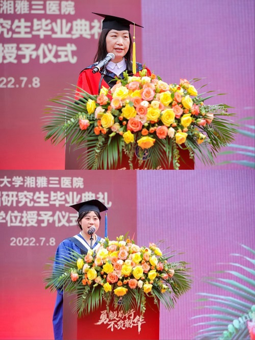 药学部主任左笑丛教授作为导师代表发言,她表达了对2022届毕业生的殷切期待与美好祝愿,希望大家不忘初心,勇毅前行。毕业生代表陈赛同学回顾了自己在湘雅三医院的三年时光,感谢了老师的关怀与教导,并希望毕业生们在未来的学习与生活中要学会在顺境中感恩,逆境中成长。