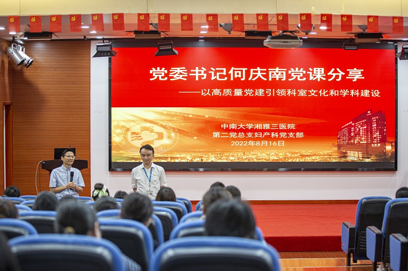 8月16日,中南大学湘雅三医院党委书记何庆南到妇产科党支部以“加强党支部规范化建设,提升支部党建工作水平——以高质量党建引领科室文化和学科建设”为主题,为全体党员及科室医护人员主讲党课。妇产科全体党员及医院部分职能部门负责人参加。党课由妇产科党支部书记徐大宝主持。
