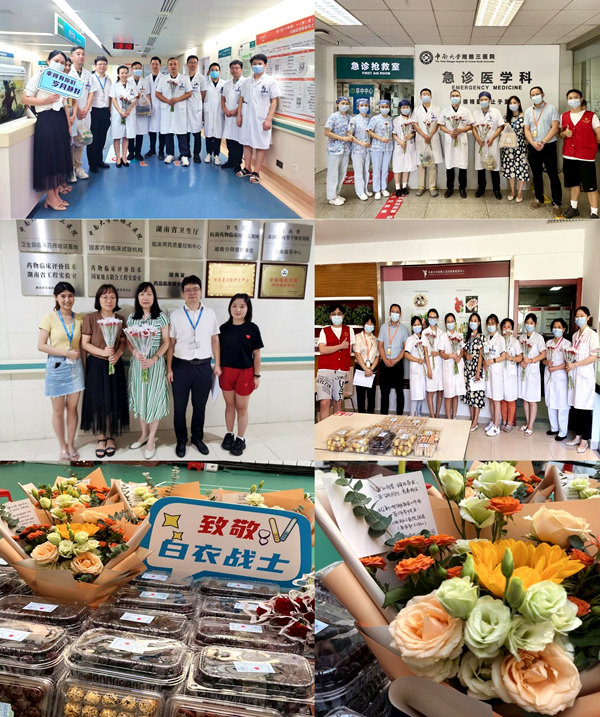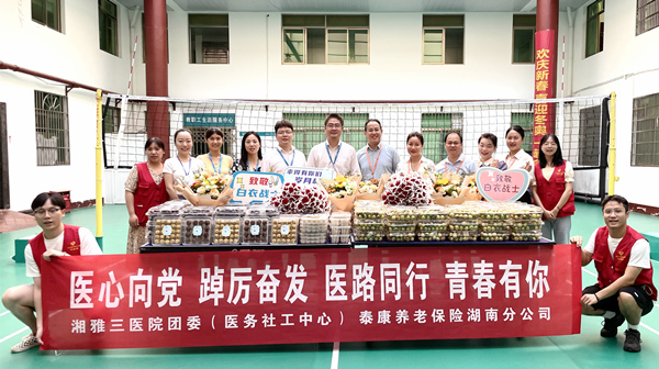 8月18日,院团委、医务社工与志愿服务指导中心携手泰康养老保险湖南分公司开展了“医路相伴 健康同行”致敬新湘雅医务工作者主题活动。活动中,院团委书记、医务社工与志愿服务指导中心主任程海威,团委副书记邓渲桐,团委委员、专职团干戴萍萍,驻点医务社工和志愿者谷芊利、罗咸宁、黄思琪、周勤政,泰康养老保险湖南分公司部门负责人李进等共同为全院临床医技科室送上了鲜花和水果、点心,以表达节日问候,凝聚奋进力量。
