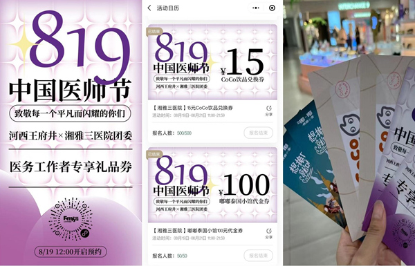 8月19日,院团委、医务社工与志愿服务指导中心联合长沙河西王府井商城共同实施了“医路相伴 青春有你”新湘雅青年关怀计划。活动面向湘雅三医院青年职工,免费提供500余份饮品代金券及用餐抵扣券等礼物,向大家致以节日关怀。