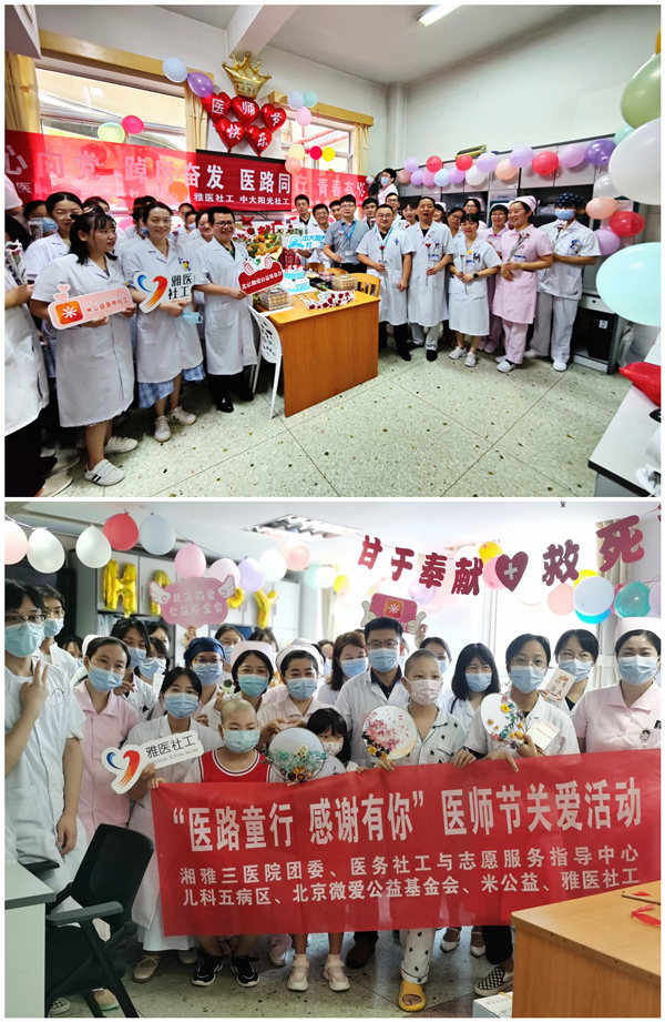 在湖南雅医医务社工中心、中大阳光社工服务中心、北京微爱公益基金会、水滴公益、米公益等公益组织和社工机构的支持下,8月19日,院团委、医务社工与志愿服务指导中心在肿瘤科及儿科开展了医师节庆祝关爱活动,肿瘤科代理主任曹科、儿科主任杨明华及科室医务人员参加了活动。
