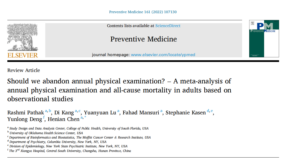 今年8月,由中南大学湘雅三医院邓云龙教授参与的课题组在美国知名期刊《PREVENTIVE MEDICINE》发表重要研究成果。该研究由来自世界各地的多位研究人员共同完成,美国南佛罗里达大学公共卫生学院的Rashmi Pathak担任第一作者、Henian Chen为通讯作者。