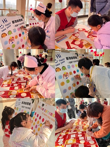 在“趣味打卡、兑换礼品”打卡集贴纸活动现场,医务社工根据孩子们的喜好设计了4个别出心裁的互动环节。“新年新面貌”互动环节中,孩子们通过在笑脸KT板上画出代表自己的头像,帮助患儿们在绘画涂鸦中尽情地表达自我,激发其想象力和创造力。“新年新希望”则是通过一张张简短卡片和一句句暖心祝福,传达孩子们对未来的憧憬及美好祝愿。活动结束后,贺卡也会集中展示在社工角,将成为病房里一道独特的风景线。“新年新气象”,则需要孩子和家人们一起制作手工DIY龙年挂饰,让其享受共同参与的乐趣,以此来增强家庭间的亲子互动和情感交流。活动在激动人心的“新年送温暖”刮刮乐抽奖环节落下帷幕,当刮刮乐卡片在患儿们满怀期待的心情中一次次被刮开,他们也收获了心仪的礼物,患儿们在活动中展现出的灿烂笑容和兴奋神情成为了这个冬天最温暖的记忆。