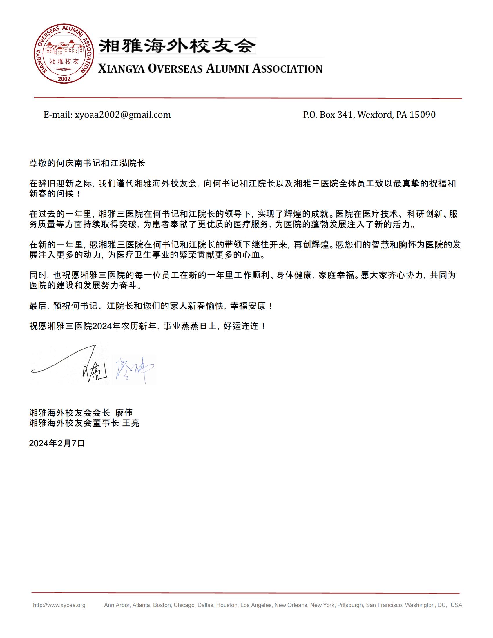 2024年2月7日,湘雅海外校友会新任会长廖伟博士、董事长王亮博士代表全体海外校友向中南大学湘雅三医院发来贺信,送上新春祝福。