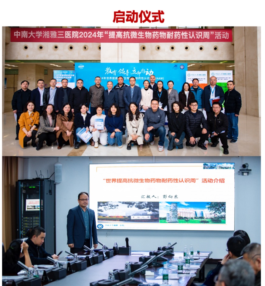 11月18日中午,“2024年世界提高抗微生物药物耐药性认识周”正式启动。启动仪式由湘雅三医院医务部主任刘作良教授主持,医院感染控制中心主任曾赛男介绍了医院抗微生物药物耐药性情况,药学部副主任(主持工作)彭向东总结了医院2024年抗菌药物使用情况并对医院开展“世界提高抗微生物药物耐药性认识周”系列活动进行介绍。抗菌药物科学化管理(AMS)小组各位成员发表相关观点并进行热烈交流。