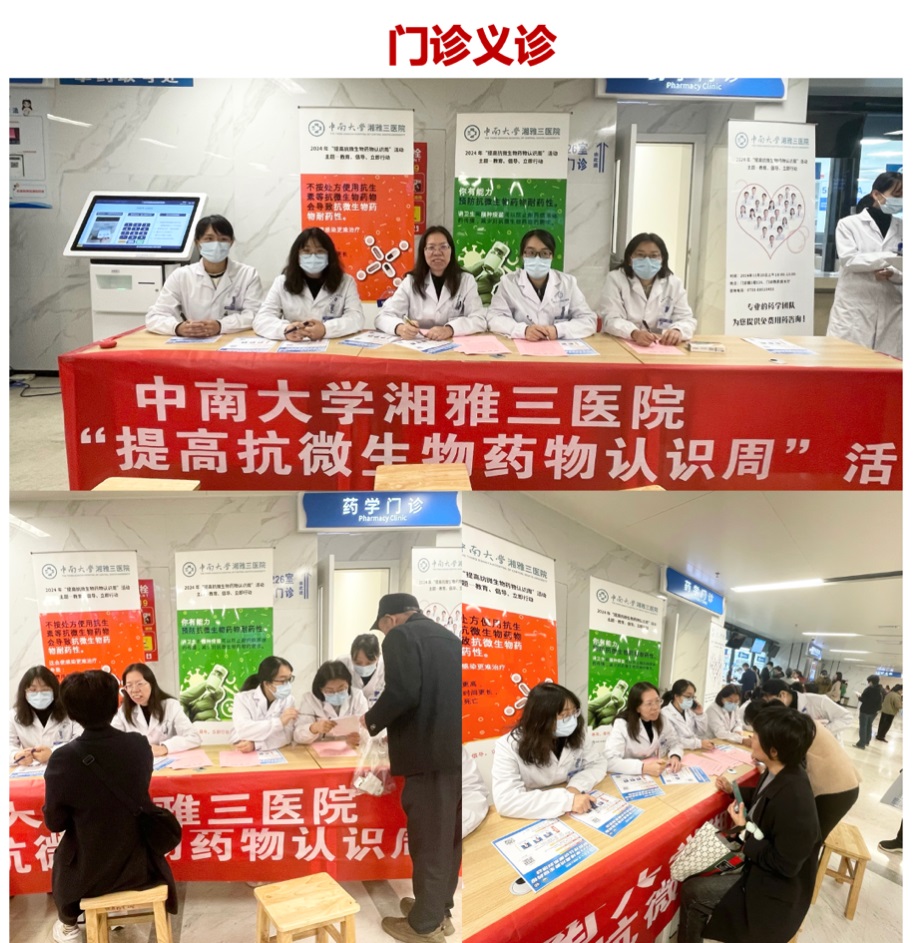 11月18~24日是世界第十个“提高抗微生物药物耐药性认识周”,湘雅三医院药学部联合医务部、医院感染控制中心、门诊部以及抗菌药物科学化管理(AMS)小组成功举办“2024年世界提高抗微生物药物耐药性认识周”系列活动。2024年的“提高抗微生物药物耐药性认识周”主题是“教育、倡导、立即行动”。此次活动旨在提高全社会合理使用抗微生物药物的意识和水平,遏制细菌耐药发展与蔓延,维护人民群众身体健康,促进经济社会协调发展。