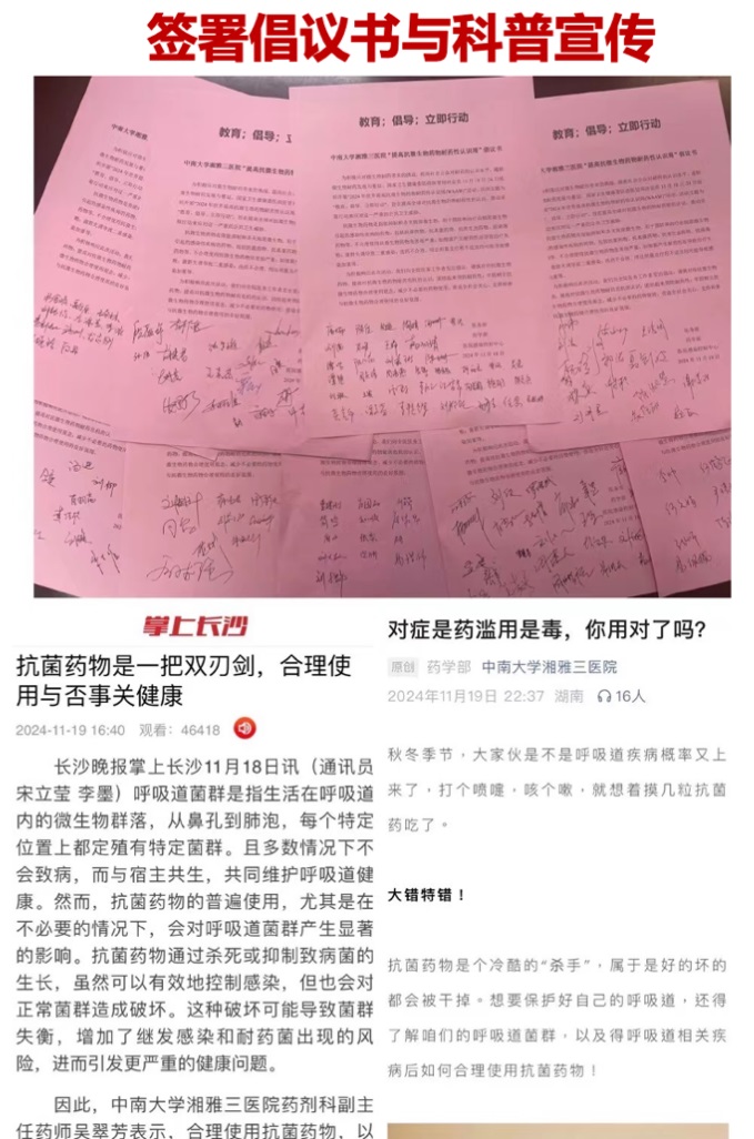 在本次“2024年提高抗微生物药物认识周”活动中,药学部通过在外科楼电子屏幕滚动显示宣传标语、门诊大厅、住院部大厅摆放宣传海报、长沙晚报掌上长沙、湘雅三医院官方公众号发布科普文章等多种形式向公众宣传正确使用抗微生物药物的相关知识。同时,药学部还联合医务部和感染控制中心发布抗微生物药物合理使用倡议书,号召全体医务人员共同参与,并将倡议书送往各科室医生及护士签名。呼吁所有人关注抗微生物药物合理使用问题,共同促进抗微生物药物的合理使用。