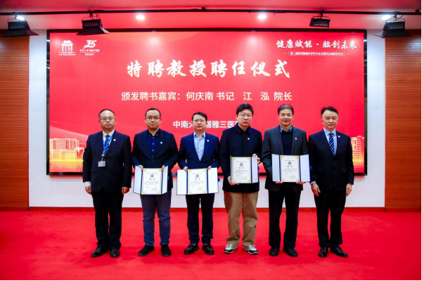 中国工程院院士、中南大学湘雅三医院首席科学家周宏灏出席论坛。暨南大学粤港澳中枢神经再生研究院李晓江教授、复旦大学生命科学学院鲁伯埙教授、陆军(第三)军医大学第二附属医院杨清武教授、上海科技大学生命科学与技术学院胡霁教授受聘为中南大学湘雅三医院特聘教授,医院党委副书记杨飞龙宣读聘任文件。论坛开幕式上,还举办了新湘雅罕见病临床研究中心成立仪式,医院党委委员、副院长左笑丛宣读中心成立文件。