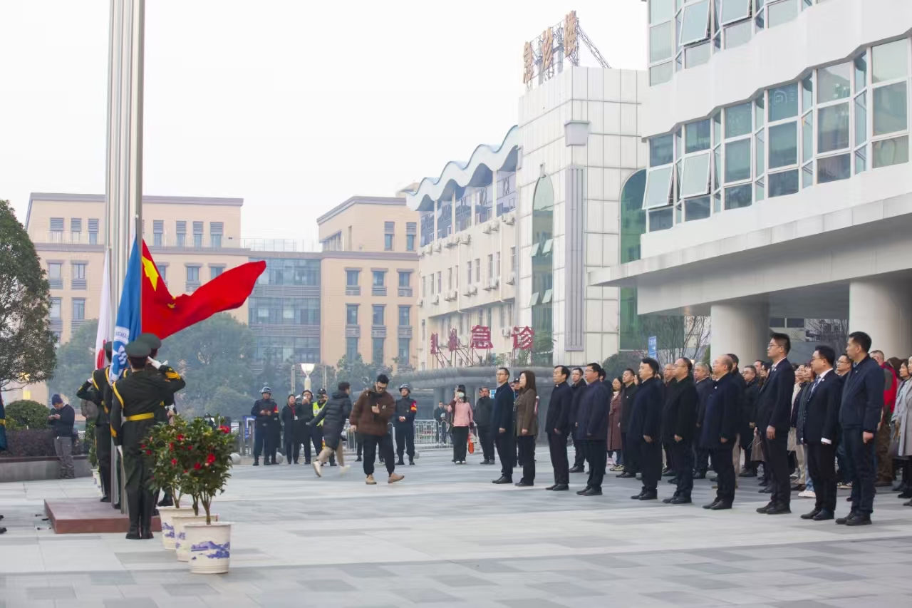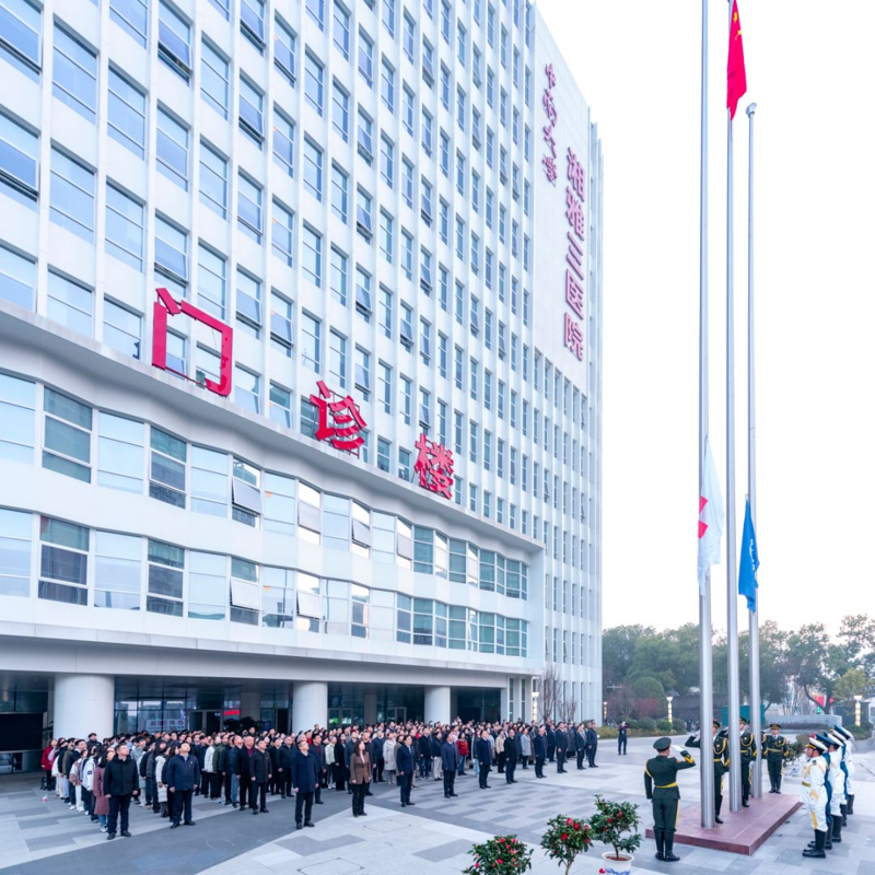 2025年1月1日上午7点30分,中南大学湘雅三医院在门诊楼前坪举行元旦升旗仪式。全体院领导,教职工、离退休和学生代表300余人共同见证2025年的第一缕晨光,在升旗仪式中共同开启新年的序幕。
