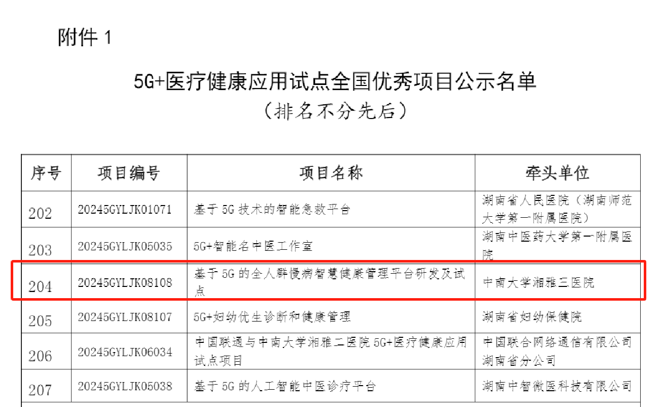2024年12月26日,国家工业和信息化部(下称“工信部”)信息通信发展司、国家卫生健康委(下称“卫健委”)规划发展与信息化司联合印发《5G+医疗健康应用试点全国优秀项目和通过验收项目公示名单》,中南大学湘雅三医院申报的《基于5G的全人群慢病智慧健康管理平台研发及试点》项目顺利通过验收并获评5G+医疗健康应用试点全国优秀项目。这一成果标志着医院在智慧健康管理方面的工作成绩获得国家级认可。
