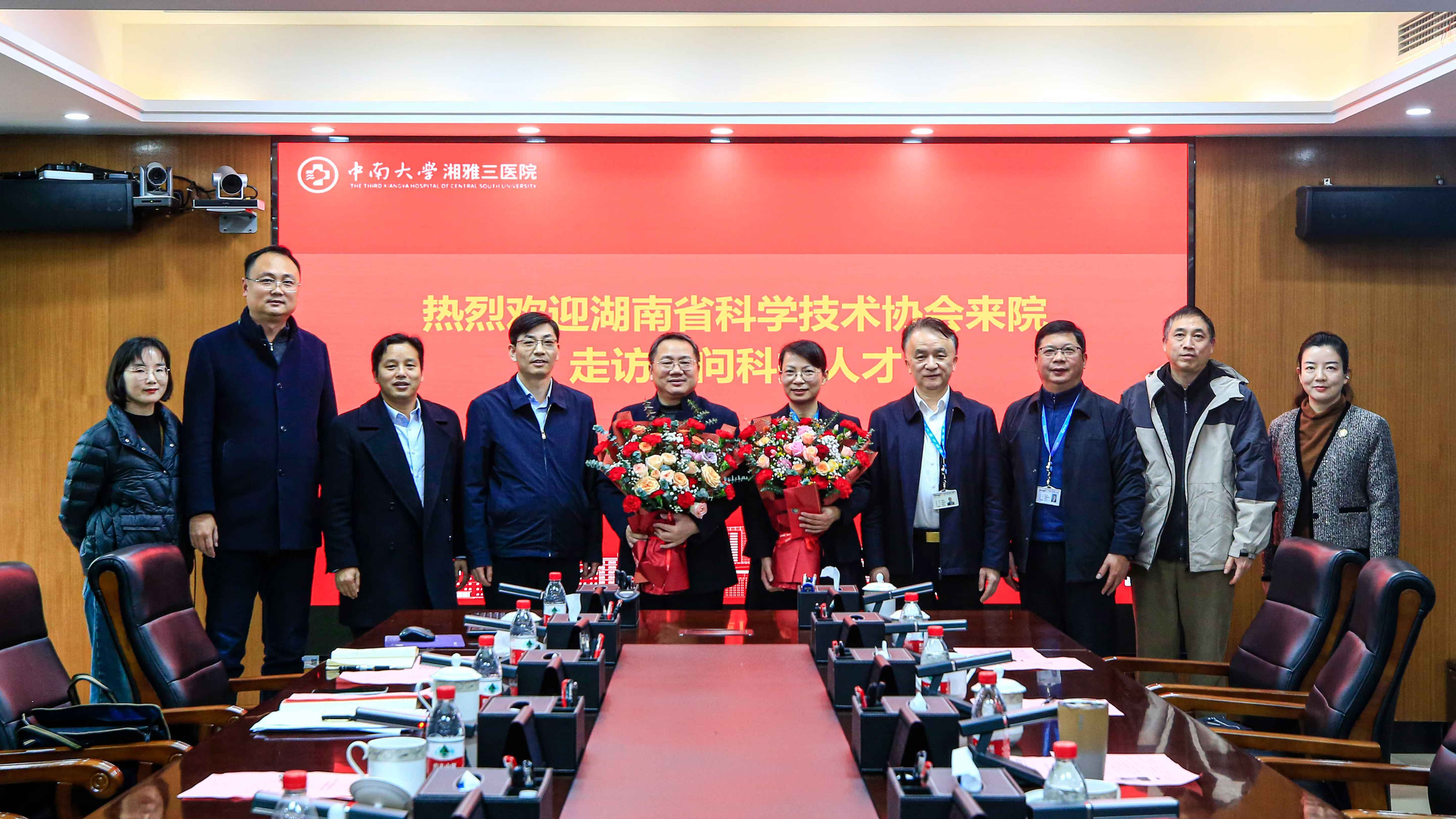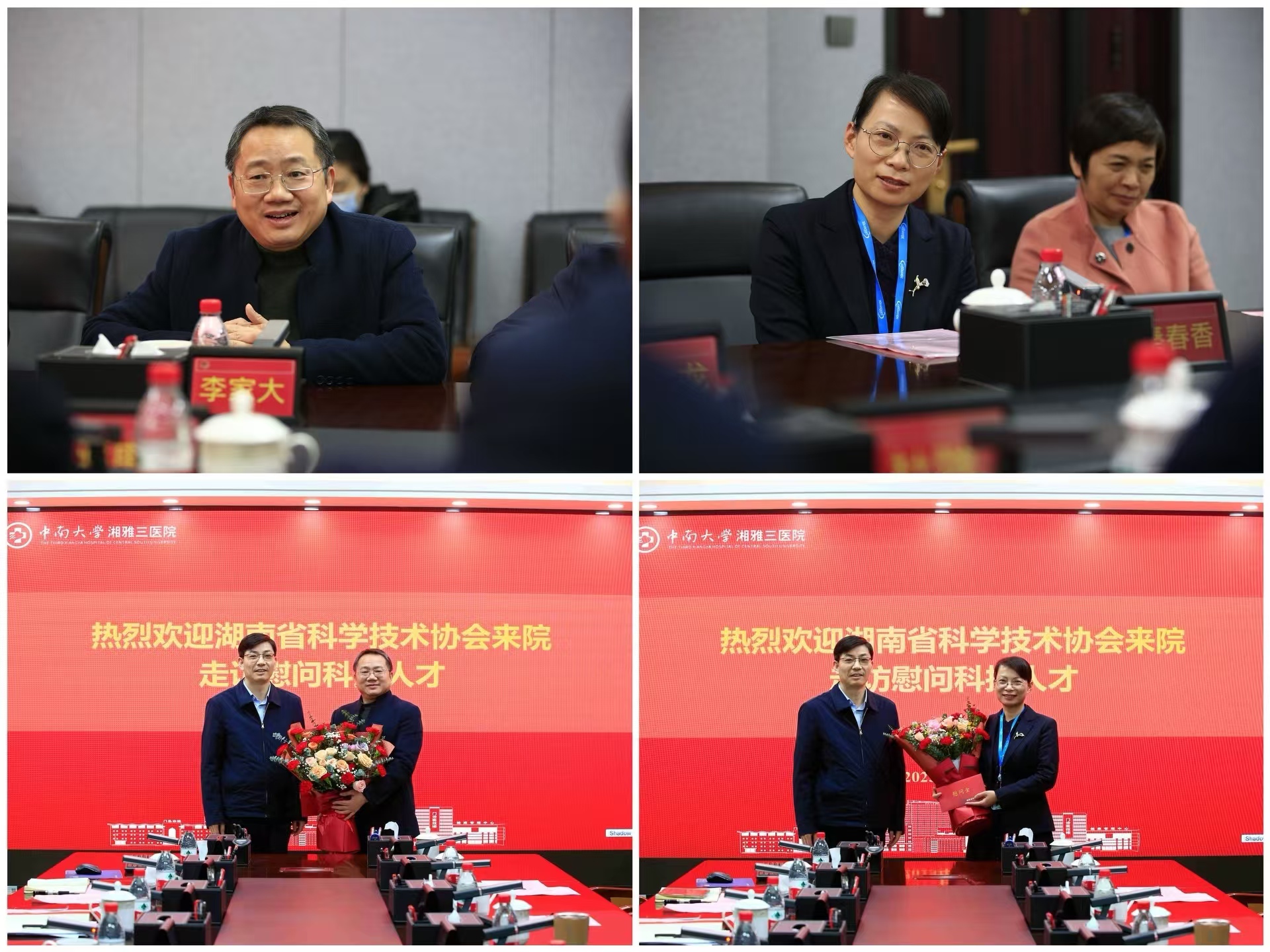 1月7日,湖南省科学技术协会(以下简称省科协)党组成员、副主席马文胜,省科协科技创新部部长蒋电波、副部长杜翀、一级主任科员谭利蓉,湖南省遗传学会秘书长胡正茂,湖南省护理学会秘书长向琴一行来到中南大学湘雅三医院走访慰问科技人才。湘雅三医院党委书记何庆南出席,生命科学学院院长李家大、湘雅三医院护理部副主任秦春香参加,党委办公室、人力资源部、护理部负责人陪同。会议由党委副书记杨飞龙主持。