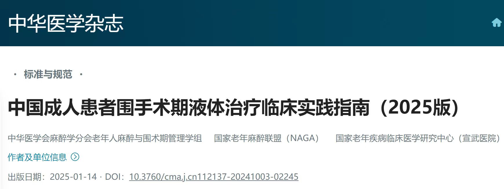 液体治疗是围手术期管理的重要组成部分,也是实现加速术后康复(ERAS)的关键环节。为规范中国成人患者围手术期液体治疗,由中华医学会麻醉学分会老年人麻醉与围术期管理学组、国家老年麻醉联盟(NAGA)和国家老年疾病临床医学研究中心(宣武医院)共同发起,首都医科大学宣武医院王天龙教授、中南大学湘雅三医院欧阳文教授和上海交通大学附属仁济医院俞卫锋教授牵头制订的《中国成人患者围手术期液体治疗临床实践指南(2025年版)》(以下简称液体指南)于2025年1月14日正式发表于《中华医学杂志》。该液体指南也由国内在液体治疗领域有深厚造诣的资深专家团进行了多轮审核修改。