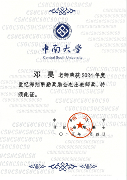 2025年1月4日,中南大学在科教楼举行了隆重的“感恩与责任”中南大学2024年度奖励金颁奖典礼,邓昊教授荣获中南大学2024年度世纪海翔酬勤奖励金杰出教师奖,是该奖项唯一获奖者,世纪海翔酬勤奖励金杰出教师奖是所有奖项中奖励金额最高的奖项。本次颁奖,中南大学湘雅三医院共有6名教师斩获佳绩。其中,4名教师分别获得“联邦医学”、1名教师获得“世纪海翔”、1名教师获得“西南铝”奖项。