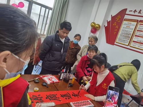 活动的一大亮点是来自博才金鹰小学的六名小学生志愿者,他们带着浓厚的节日热情,专程为病友们书写新春对联和福字。每一副春联都承载着对病友的美好祝愿,其中“春风送暖启康健”“蛇年新篇创辉煌”等内容,既有传统的节日祝福,又融入了对血液病患者早日康复的期盼。孩子们的书法作品工整大气,寓意深远,深得病友和家属的喜爱,纷纷前来驻足观看,并与孩子们互动,感受到浓浓的节日温情。