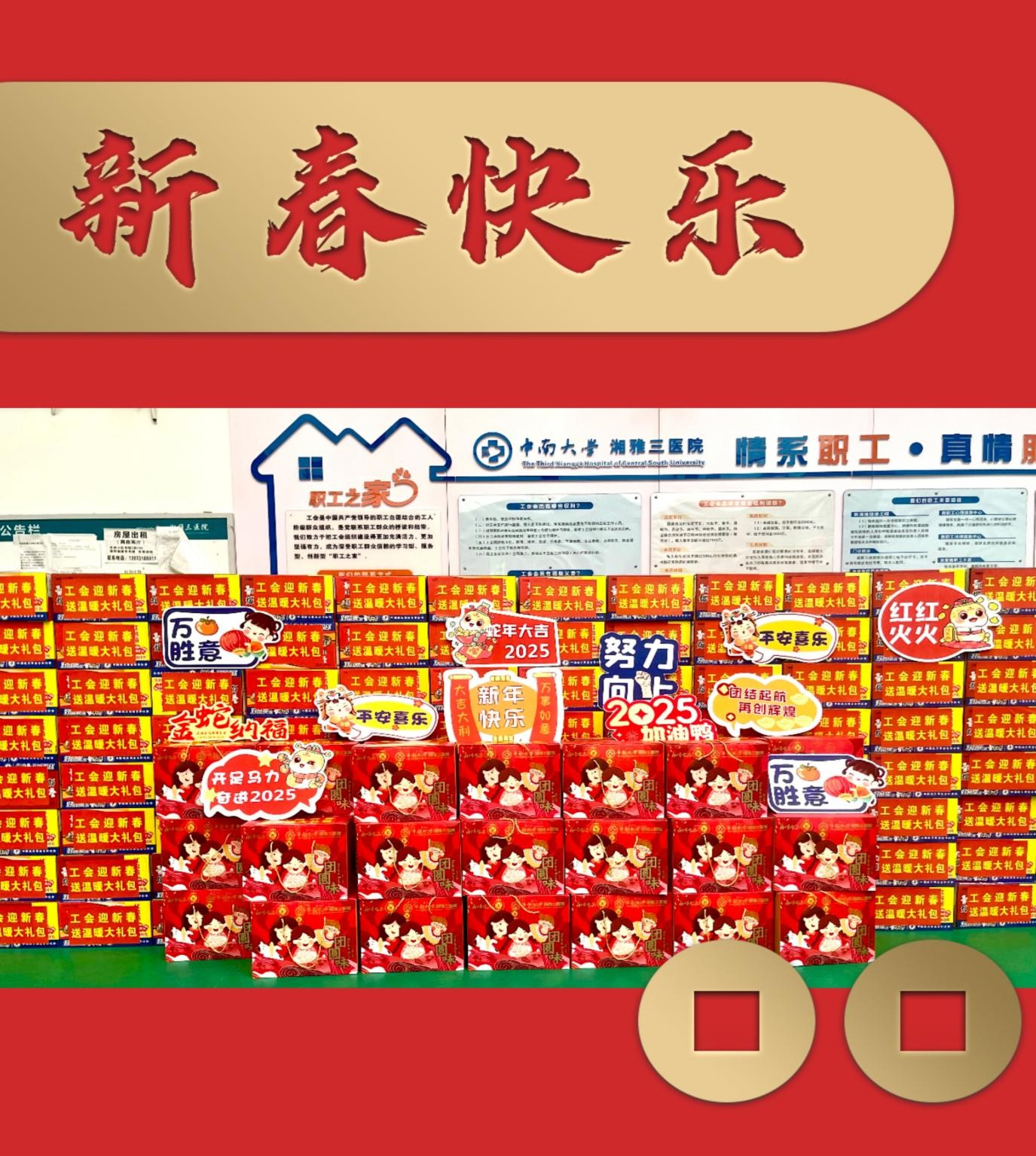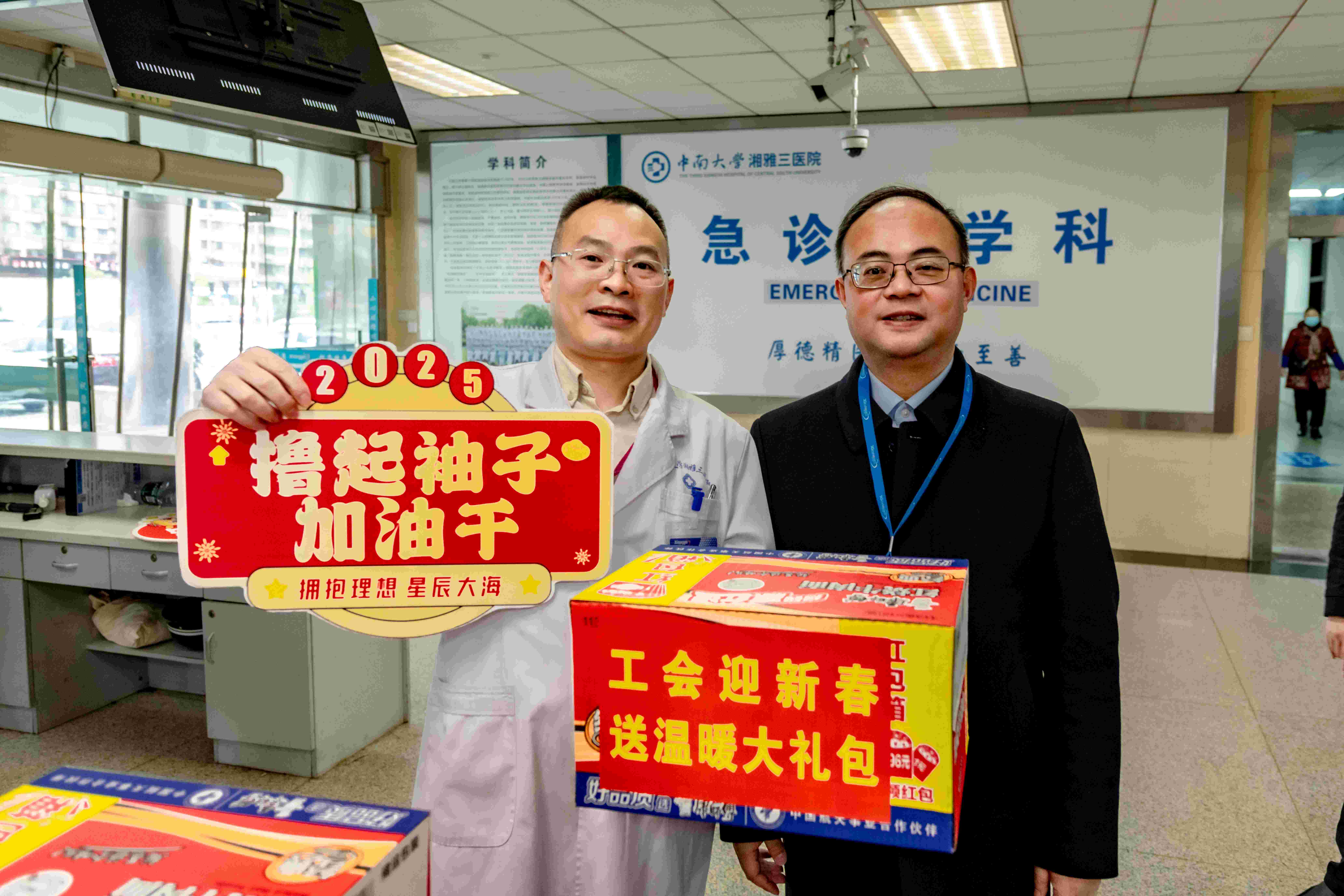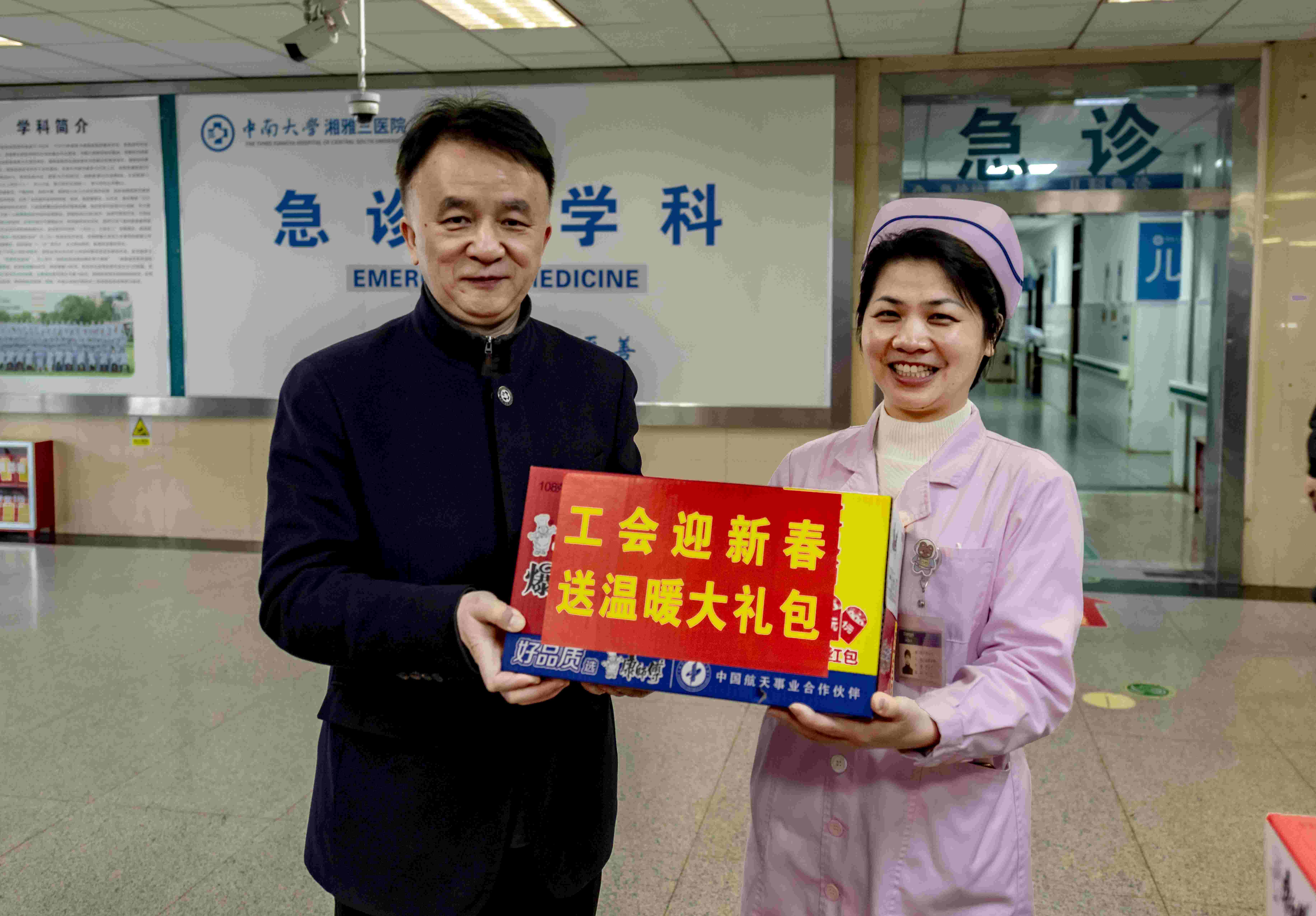 祥龙贺瑞辞旧岁,福巳呈祥启新程。在2025年新春佳节来临之际,中南大学湘雅三医院党委书记何庆南,党委副书记、院长江泓,党委副书记、工会主席杨飞龙,党委委员、副院长孙传政等院领导率党委办公室、医院办公室、工会等慰问组成员,于1月26日上午深入医院门诊楼、急诊楼的20余个工会小组开展春节前送温暖慰问活动,向辛勤耕耘在医疗一线的工作人员致以诚挚问候和衷心感谢,并将新春的祝福和“工会关爱礼包”送到每一位职工手中。