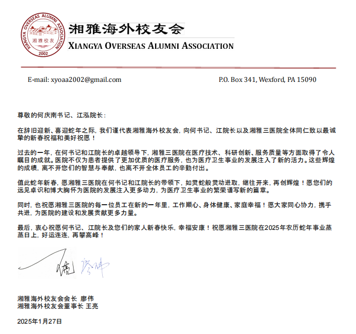 2025年1月27日,湘雅海外校友会会长廖伟博士、董事长王亮博士代表全体海外校友向中南大学湘雅三医院发来新春贺信,送上诚挚的祝福。