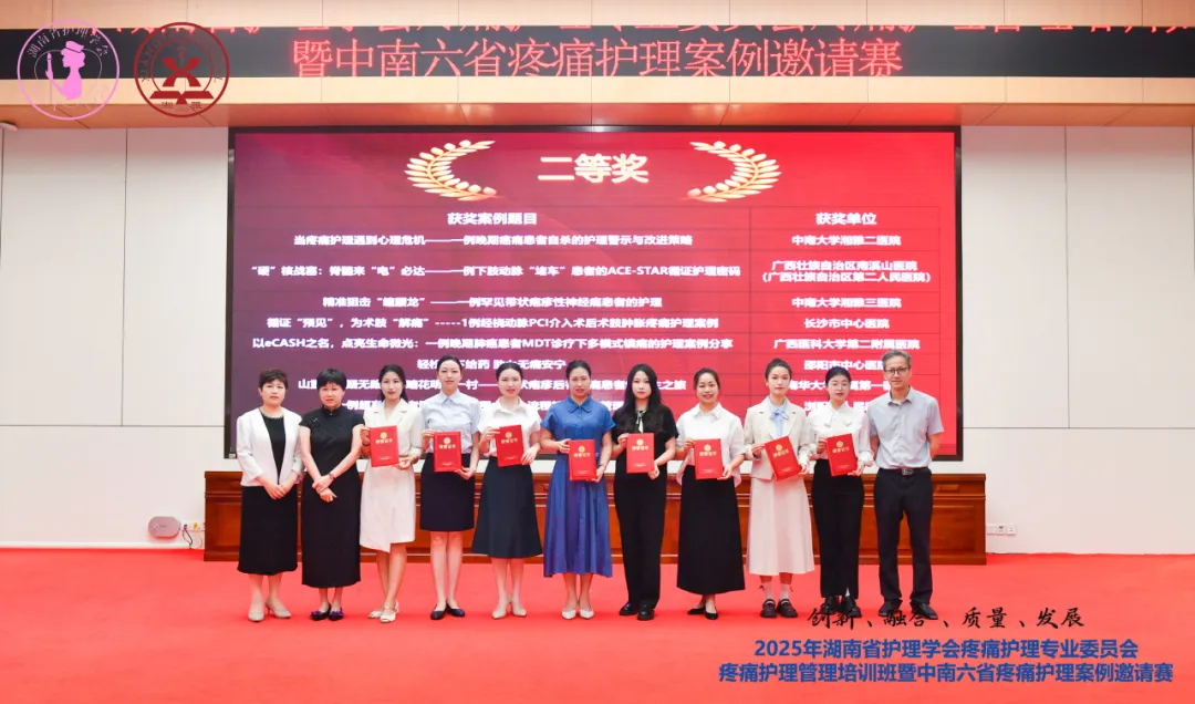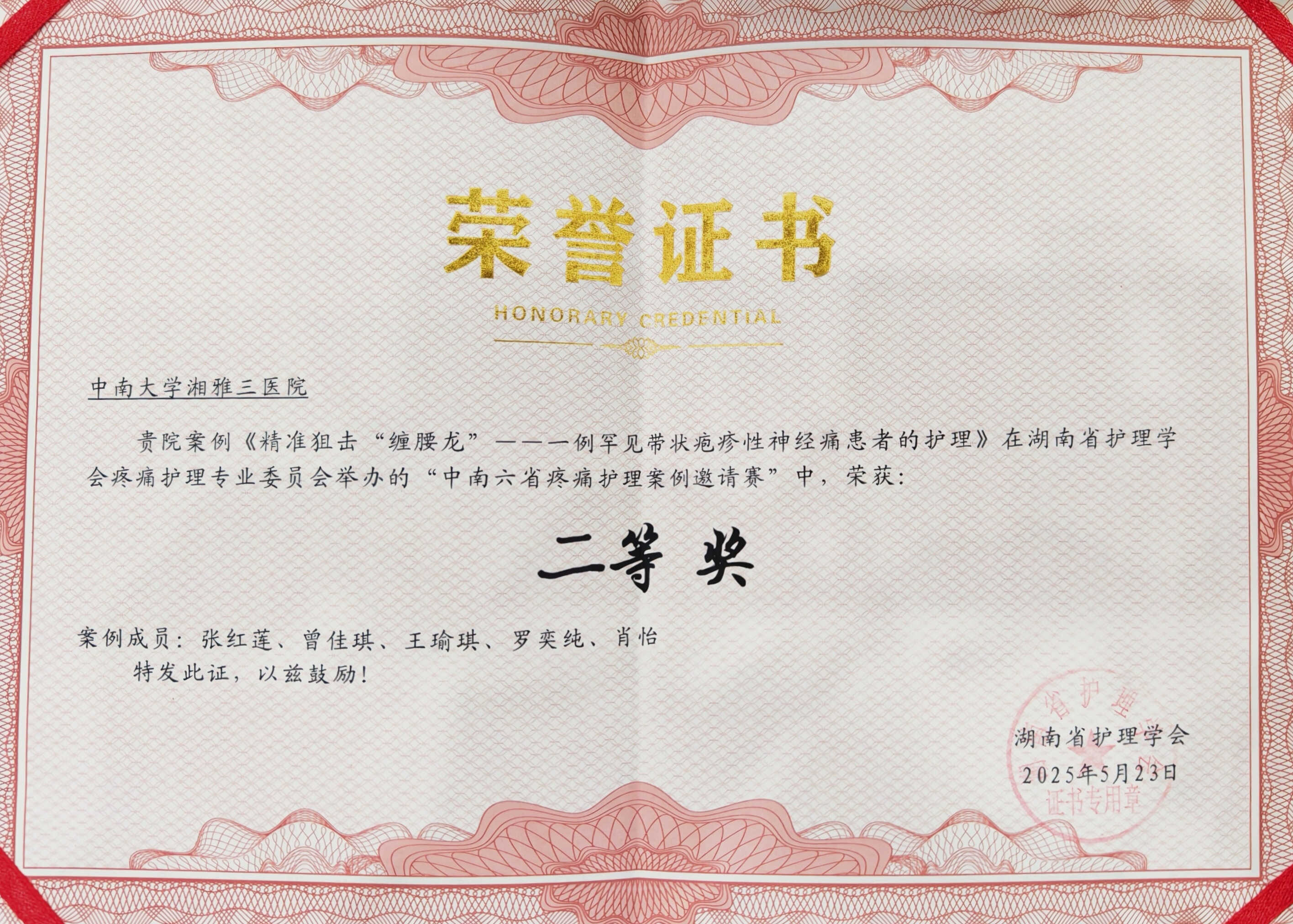 5月22日,由湖南省护理学会疼痛护理专业委员会举办的“中南六省疼痛护理案例邀请赛”在长沙举行,中南大学湘雅三医院张红莲护士长带领疼痛科曾佳琪、王瑜琪、罗奕纯、肖怡组成的护理团队凭借《精准狙击“缠腰龙”——一例罕见带状疱疹性神经痛患者的护理》案例,经过激烈角逐,最终在86支参赛队伍中脱颖而出,荣获大赛二等奖。