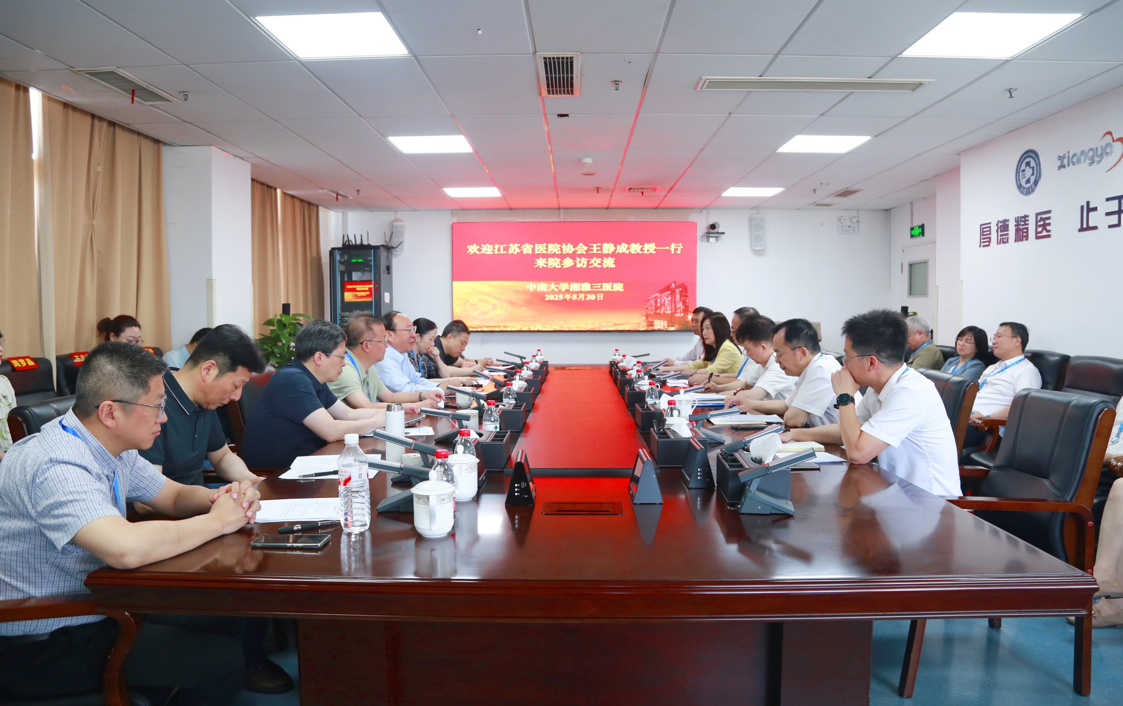 2025年5月30日,江苏省医院协会医院评审评价与管理研究会专委会主任委员王静成率领江苏省医疗系统代表团来到中南大学湘雅三医院考察交流。代表团包括江苏大学附属医院院长陈吉祥、南京医科大学第三附属医院副院长倪昕晔等25位江苏省各级医疗机构负责人及管理专家。