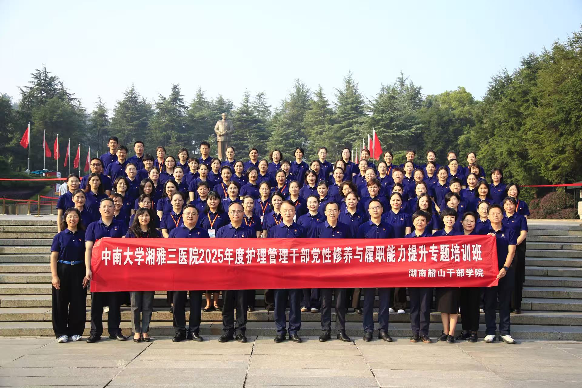 为全面提升护理管理干部的党性修养与履职能力,10月10日至11日,中南大学湘雅三医院党委办公室与护理部联合在湖南韶山干部学院成功举办“护理管理干部党性修养与履职能力提升专题培训班”。全院护理部、护理教研室成员及各病区护士长、副护士长共计85人参加培训。本次培训以“传承韶山精神,强化实干担当,全面提升护理管理干部党性修养与履职能力”为主题,通过专题教学、现场体验、理论授课与实践研讨相结合的方式,将红色基因传承与护理管理实战需求深度融合。