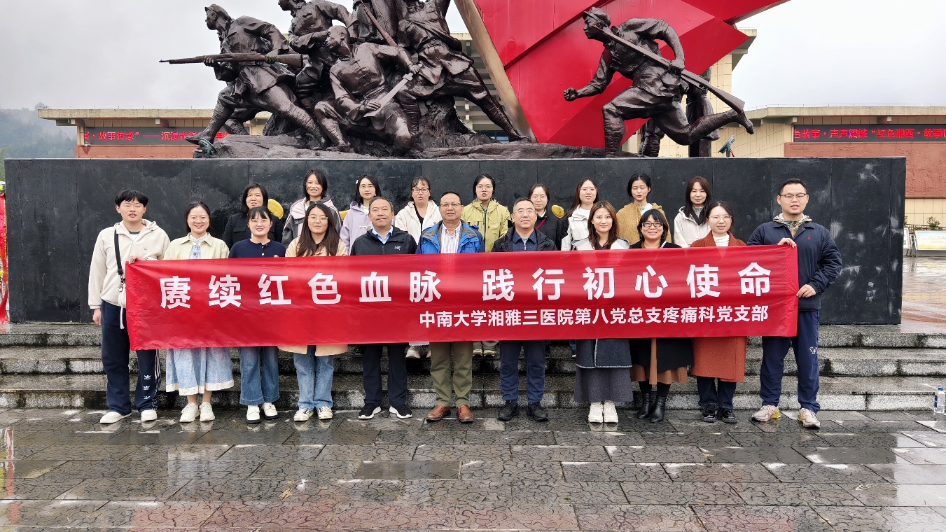为深入学习贯彻习近平新时代中国特色社会主义思想,巩固拓展主题教育成果,激励全体党员在学科建设中担当作为,10月25日,疼痛科党支部组织全体党员奔赴“中国工农红军长征最后出发地”——龙山县茨岩塘镇,在湘鄂川黔革命根据地纪念馆开展了以“赓续红色血脉,践行初心使命”为主题的党日活动。