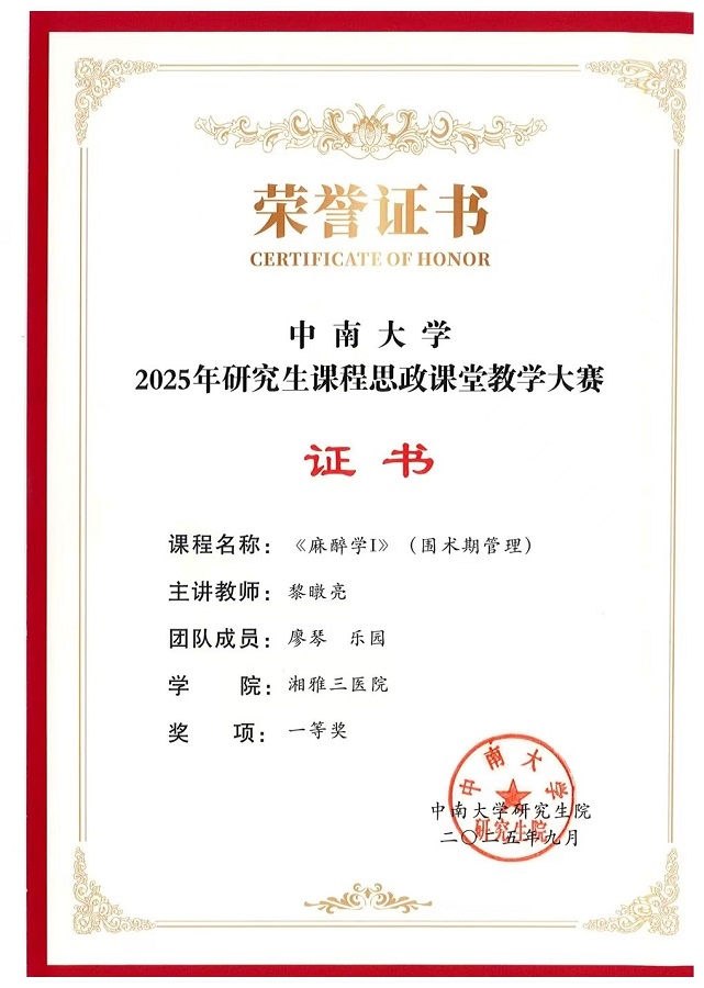 近日,由湖南省教育厅主办、湖南中医药大学承办的第三届湖南省研究生课程思政课堂教学大赛决赛圆满落幕。中南大学湘雅三医院麻醉科黎暾亮讲师凭借独具特色的教学设计与深厚的思政素养,在理工农医类赛道中脱颖而出,荣获湖南省二等奖、中南大学一等奖,展现了湘雅三医院在研究生思政教育领域的扎实功底。