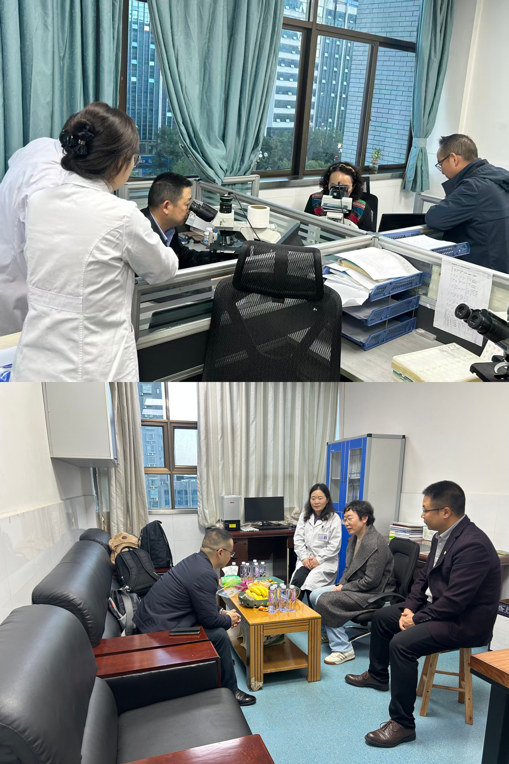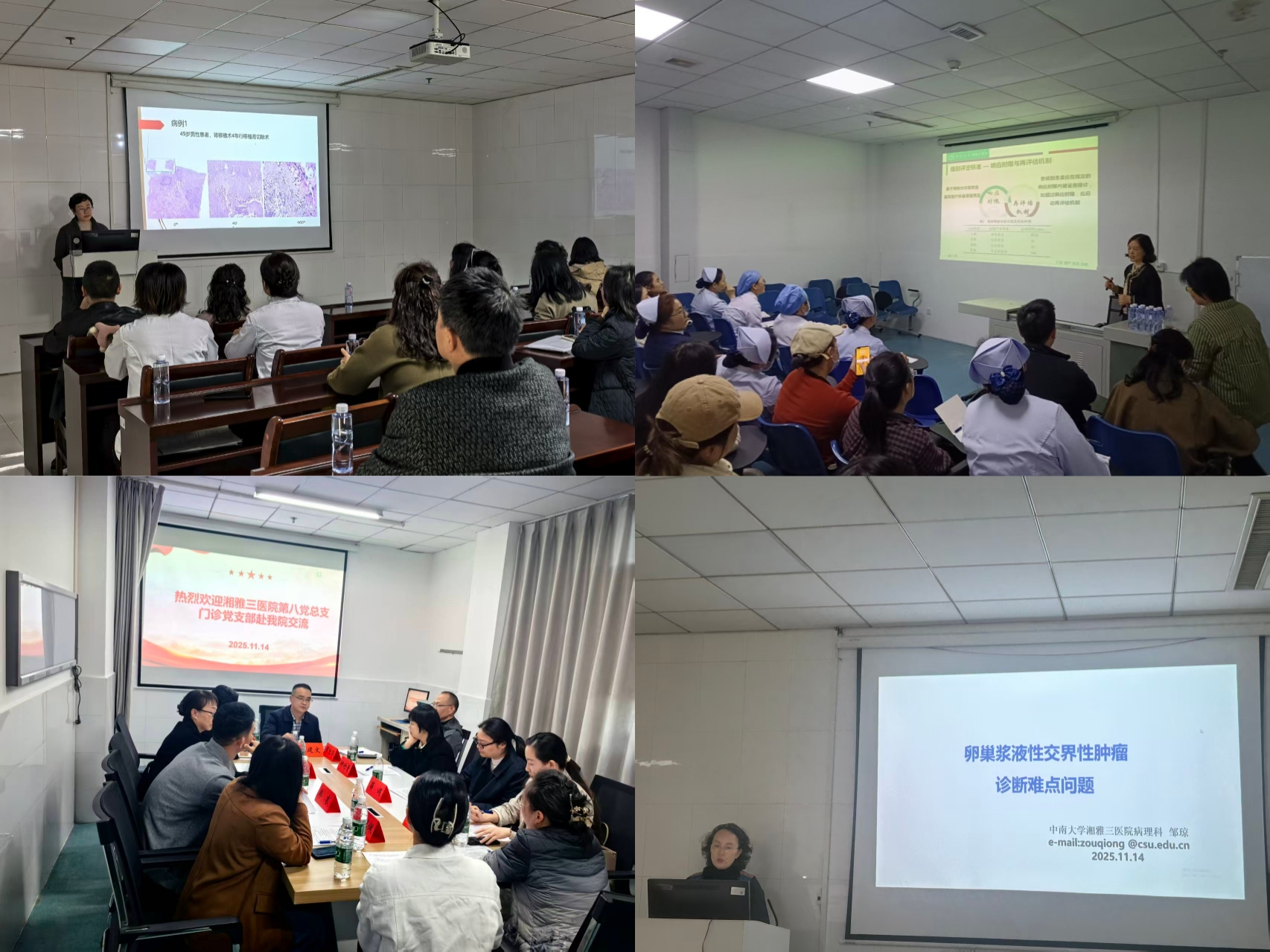 病理科党支部首先为湘西州人民医院病理科的全体同仁带来了两场精彩的学术盛宴,初令主任做了“多维诊断体系助力感染相关病变诊断”的讲座,邹琼副主任针对“卵巢浆液性交界性肿瘤诊断难点问题”进行了详细解读,陈倩副主任及付华老师在科内进行多头阅片指导。接着,初令主任与湘西州人民医院副院长张建文、病理科主任彭英霞就“医院层面如何托举病理科全方位发展”这一议题做了较深度的交流,初令主任表示:湘雅三医院与湘西州人民医院历来关系紧密,亲如一家,今后会继续不遗余力协助病理科的发展。最后,双方围绕如何以党建为抓手破解业务难题、如何激发党员在关键岗位的先锋模范作用、如何构建更高效的跨部门协作机制等议题展开了充分研讨,相互启发,收获颇丰。