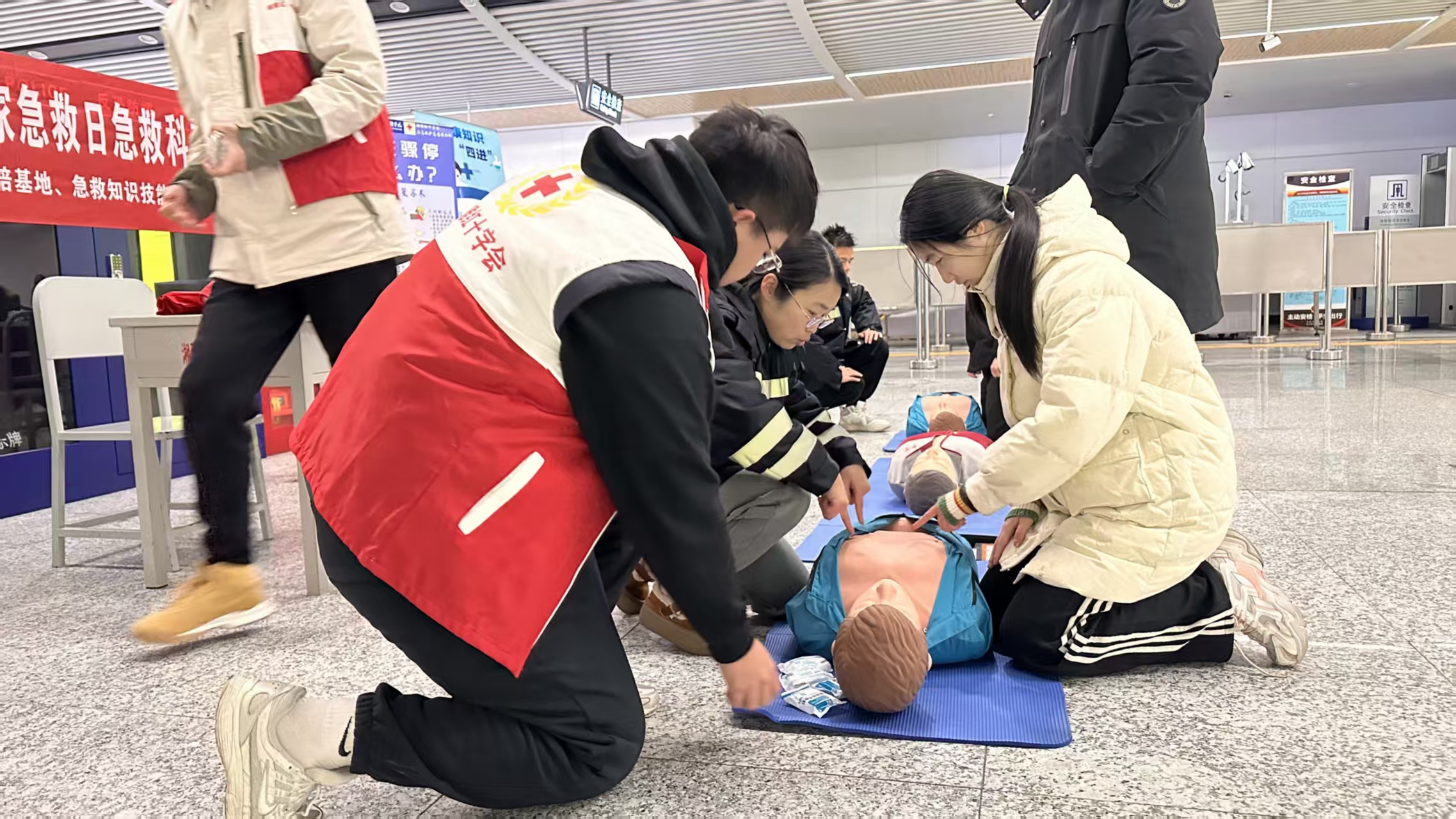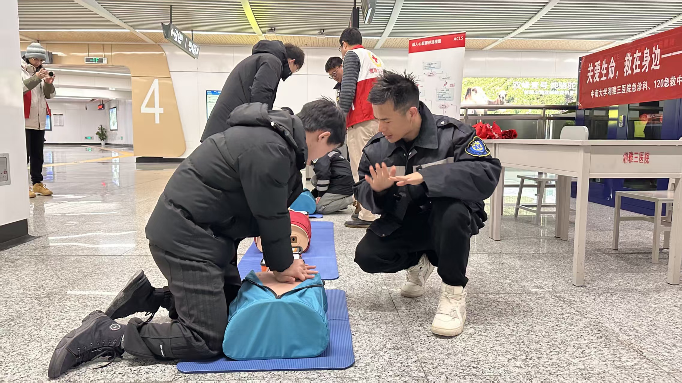 上午10点30分,湘雅三医院地铁站大厅内热闹非凡。由中南大学湘雅三医院急诊医学科120急救中心、中南大学湘雅医学院、长沙穗城轨道交通有限公司联合主办的“人人学急救,急救为人人”主题活动拉开帷幕。活动现场设立了多个互动区域,核心的心肺复苏(CPR)实操区吸引了大量乘客驻足。在专业急救导师“手把手”的指导下,市民们轮流在模型上进行胸外按压和人工呼吸练习,从最初的生疏到逐渐掌握节奏,学习热情高涨。