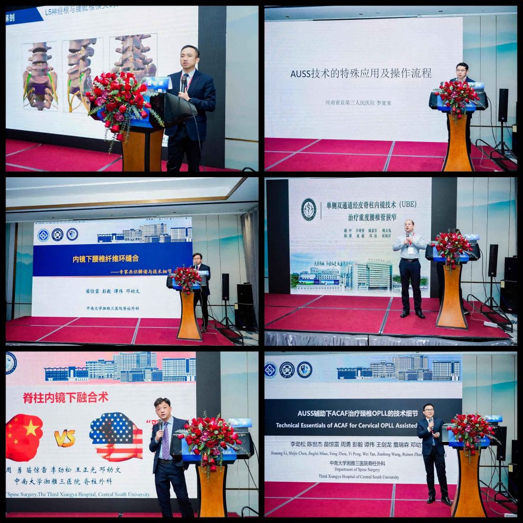 本次精品培训班汇聚省内外脊柱外科微创领域专家及同道,构建了“理论授课+实操演示+互动研讨”三位一体的教学模式。南华大学附属第一医院晏怡果教授以《AUSS远外侧入路治疗远端综合征》为题展开授课,通过实际病例演示AUSS技术在远外侧入路术式中的操作细节与注意事项;河南省直第三人民医院李宽宽教授作题目为《AUSS技术的特殊应用及操作流程》的报告,鼓励学员在临床上积极创新;南华大学附属第一医院谢中教授以《UBE—ULBD治疗腰椎管狭窄的流程、细节和注意事项》为题作报告,将镜下微创手术的细节和难点传授给培训学员。湘雅三医院苗惊雷教授以《内镜下腰椎纤维环缝合——专家共识解读与骨锚定相关技术细节》为题,结合《腰椎纤维环缝合技术应用的专家共识》的核心要点,深入解析了纤维环缝合技术的适应证选择、操作规范及并发症防治策略;周勇教授围绕《脊柱内镜通道下融合术的抉择:单或双?》展开专题授课,系统对比了单通道与双通道技术在脊柱融合术中的应用场景、技术优劣及临床决策要点,为学员提供了微创手术的个体化治疗方案及思路;李劲松副教授以《AUSS辅助下ACAF技术在颈前路减压重建中的应用与技巧》为主题,结合复杂颈椎后纵韧带骨化症诊疗案例,详细阐述了AUSS内镜辅助技术在颈椎前路减压重建中的操作细节与神经保护策略,展现了“在生命禁区雕花”的精准诊疗能力。