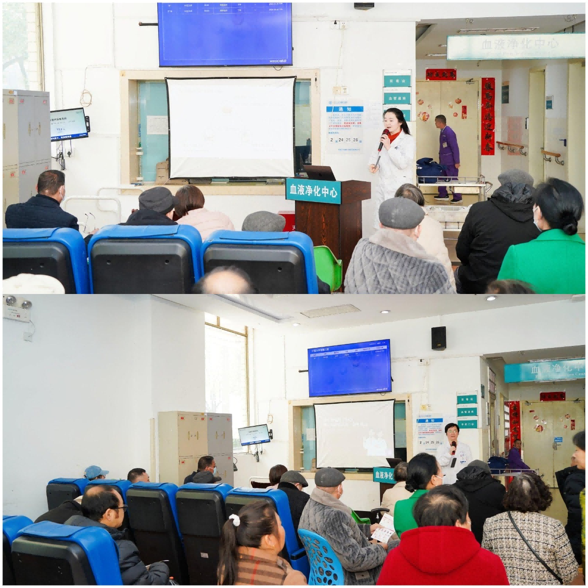 中午12点,血液净化中心主题患教活动紧锣密鼓地拉开帷幕。孙永超副教授、龙春姣副教授在血液净化中心大厅进行主题授课,孙永超以《高磷血症的诊治》为题,结合透析患者临床特点,细致讲解高磷血症的发病机制、危害及科学干预方案,帮助患者掌握控磷饮食与药物治疗要点;龙春姣围绕《慢性肾脏病肾性贫血》,解析贫血的成因、监测指标与治疗策略,手把手指导患者如何通过饮食与治疗改善贫血状态,提升生活质量。