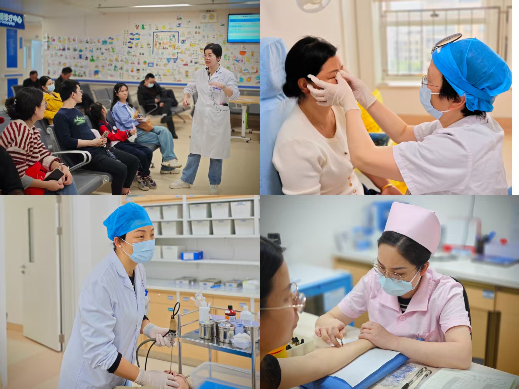 4月10日上午,耳鼻咽喉头颈外科在门诊候诊大厅开展爱鼻日首场义诊与科普讲座。科室专家团队与护理团队紧密配合,为前来就诊的患者提供全方位的诊疗服务。活动现场,马艳红副主任医师、陈玉副主任医师进行义诊坐诊,耐心地为患者进行病史询问、专科体格检查,针对过敏性鼻炎、鼻窦炎等春季高发疾病,制定了科学、个性化的诊疗方案。为切实减轻患者负担,活动特别推出了惠民举措,为10名就诊患者免费提供皮肤过敏原检测或鼻腔内窥镜检查。检查室里,李维副教授认真专业地为患者做鼻腔内窥镜检查,邱秀红主管护师耐心细致地为患者进行皮肤过敏原检测并做了全面的健康宣教。