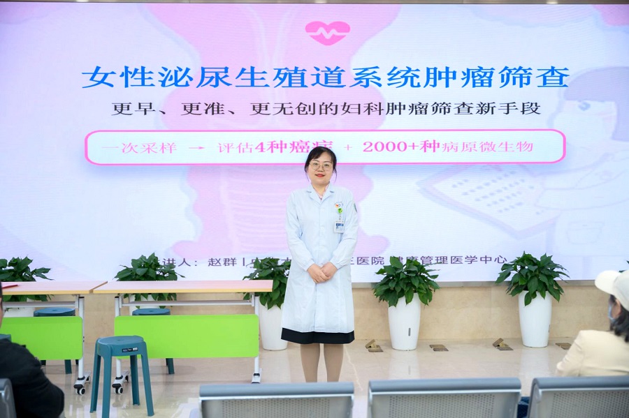 赵群副教授以《更早、更准、更无创——聊聊女性生殖道肿瘤筛查的新手段》为题,从宫颈癌、卵巢癌、子宫内膜癌、输卵管癌四种常见女性生殖道肿瘤入手,逐一剖析其发病特征与传统筛查方法的局限。随后,她通过数据对比和真实案例分享,重点介绍了一项灵敏度达94.3%、特异性超过95%的早筛新技术,为女性高发癌症早筛提供了更精准、无创的解决方案。讲解过程中,赵群副教授时而抛出幽默比喻,时而与台下互动问答,现场掌声与笑声交织,门诊大厅瞬间升级成卓越的“科普舞台”。