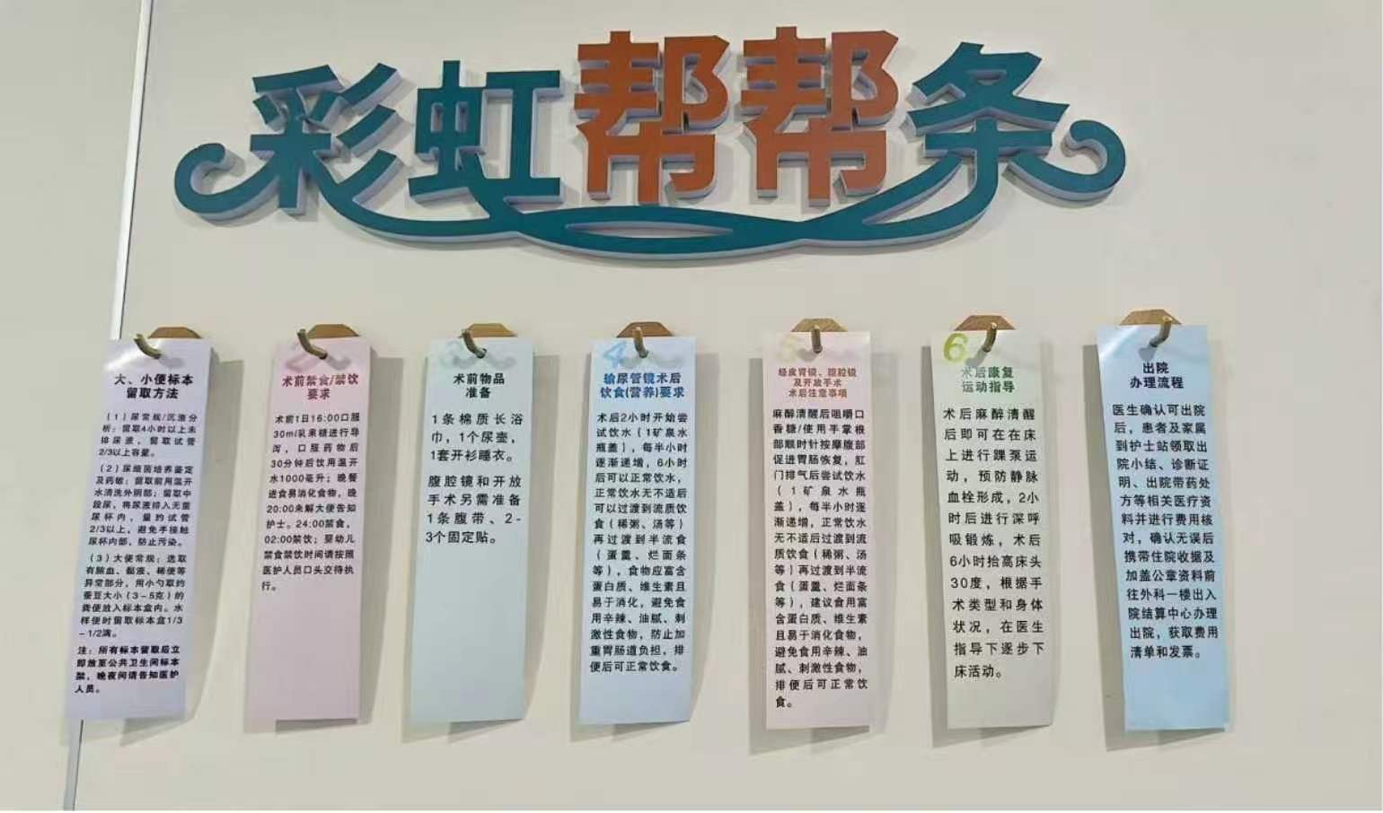 护士婷婷在高铁站看到墙上的彩虹指引条,觉得清晰又方便,便向护士长提议:把这种形式搬进病房。科室集体讨论后,设计了“彩虹帮帮条”——不同颜色对应不同事项:红色为术前准备、蓝色为术后注意、绿色为入院检查等。每张彩条简短列出核心要点,患者随手可取。护士忙碌时,递上一张对应彩条,配合一两句讲解,患者一看就懂。