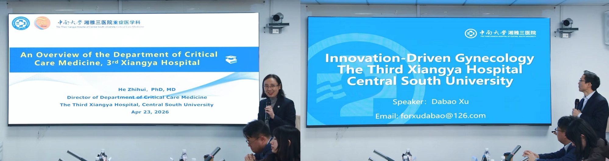 重症医学科主任何智辉、妇科主任徐大宝分别作学科专题介绍。重症医学科为国家临床重点专科、国际体外生命支持组织(ELSO)成员单位,常规开展 ECMO、CRRT 等核心技术,开设国家级慕课《重症医学》,聚焦精准重症与智慧ICU建设;妇科为国家临床重点专科、国家妇产区域医疗中心,微创手术率超90%,原创冷刀宫腔镜技术获国际大奖,形成以微创创新为品牌、以机器人手术、聚焦超声技术和宫腹腔镜手术为特色的发展模式。