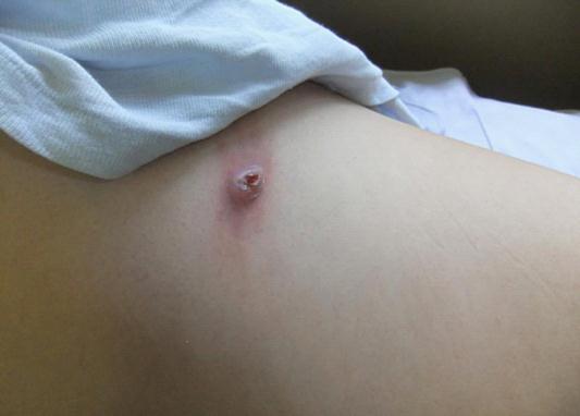 查看患者腹背和四肢有好几个象疖肿和风团一样的病变,其中有四个肿块中央破溃,呈火山口状。患者说两周前发现身上有几处红点,以为是蚊子叮咬所致,没有在意。后来红点逐渐增大,周围皮肤发红,疼痛难忍。来医疗队前一天晚上泡澡的时候,无意中发现腹壁一个包块中央有一个黑点在动,于是用手指捏住,使劲一扯,竟然扯出一个玉米粒大小的活虫,当时觉得头皮发麻,惊出一身冷汗。赶紧查看其它几个包块,又取出三个虫子,心想身上怎么这么多虫子,这东西会不会进入血液,循环到全身啊?患者立即到当地一家私人诊所就诊,花了50美元挂号费,医生诊断为寄生虫感染,但也不清楚是哪一种寄生虫,给他开了一些药。因为诊断不明,患者一直不放心,打听到中国医疗队驻地后就找来了。