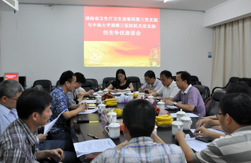 6月7日上午,湖南省卫生厅卫生监督局党委副书记蔡敬、副所长康诚一行14人,在该局第三党支部书记余新民带领下,与湘雅三医院机关党支部进行了创先争优经验交流。院领导吴希林、朱晒红、邓云龙参加了座谈。