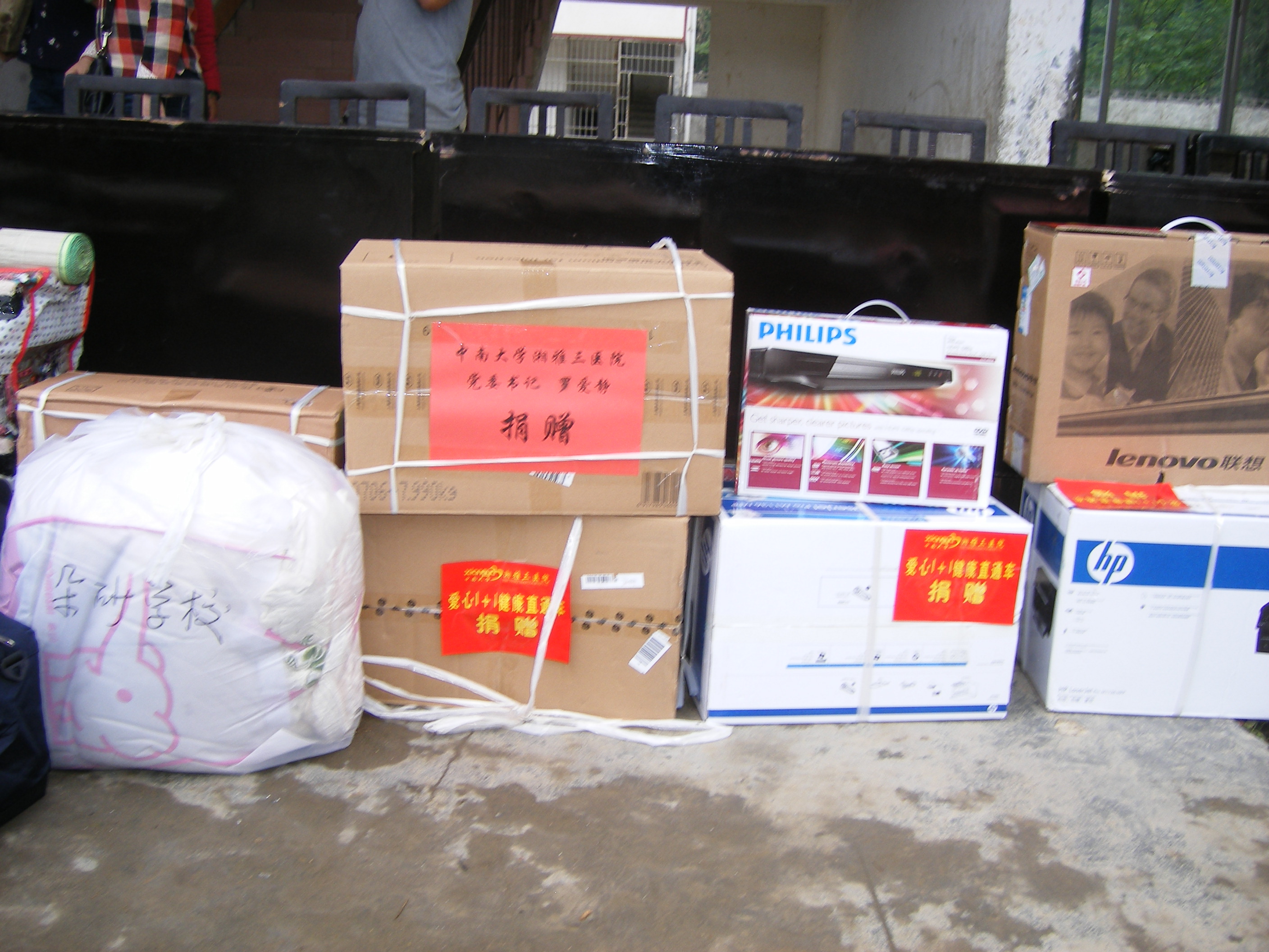 活动由离退休支部发起,机关、医技、离退休三个支部共同组织。活动一开始,三个支部积极行动。党委书记罗爱静购了1000元全新的书籍;党委副书记吴希林、邓云龙均率先捐款;离退休人员踊跃参加捐款、捐物。我们收到的第一笔捐款来自于80多岁的史毓阶老院长,他拄着拐杖、喘着粗气将1000元交给我们;张梦玺教授、刘浔阳教授、李瑞珍教授、朱雪阳教授、巫爱琳老师冒着大雨每人捐来1000元爱心款;杨辉芳老师家庭并不富裕,因病行动不便,他爱人万克青教授执意两夫妇共同捐2000元爱心款,我们考虑到他们的实际困难,曾劝她献爱心不在于每人捐款多少,重在人人参与,她当场流着泪急忙抢答:”我看了电视,山区贫困的人太艰难了,我再困难比他们要好,这款一定要捐!”家住院外带孙儿孙女的、或在院外被返聘的退休人员也纷纷赶来捐物、捐款:左定岚老师大热天乘公交车从河东赶来,汗流浃背带来大包小包的衣物并捐了款,游有志身体一直不好,那天打的运来棉被、蚊帐等山区孩子急需物品并捐了款,刘亚洲特从现单位请假赶来捐款,尹立家境一直困难,也捐来了钱、物……仅仅7天时间,离退休办、关工委募集爱心捐款21200元、衣物18编织袋、娃娃两编织袋、书包一编织袋,学习用品一编织袋。离退休支部、机关支部、医技支部共募集43740元,分别用于为两所山区小学购买学习、体育、美术用品和教师办公用品,为学校创建了全新的图书室、购置了全新的教师办公电脑桌、椅、两校148名孩子人人都收到一个爱心包(包括十件崭新的学习用品)。捐赠当天虽有下大雨,整个山区沉浸在一片欢乐的海洋中。