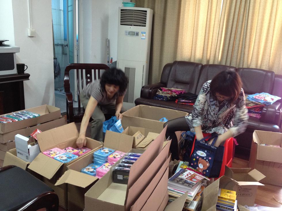 离退休办的姐妹们在姜主任有条不紊的工作分配中完成了各项工作:姜永兰本人负责总策划及所有宣传横幅制作联系、车辆联系、体育用品和玩具购买;彭艳负责捐赠款项、物质的管理和分配发放安排;彭艳、杨建叔负责采购所有图书、文具、148个孩子的礼品袋及所有孩子的个人心愿礼品;杨建叔负责所有的宣传报道的文稿及联系发稿;刘梦春负责购买所有捐赠电器(电脑、打印机、dvd等)及所有捐赠款、物文字汇总及账务管理;齐正辉、肖正杰负责所有捐款、捐物的收集、归类、打包和装箱。