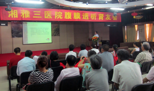6月27日上午九点,湘雅三医院腹膜透析肾友会在我院健康管理中心六楼如期举行,参加会议的有肾内科医务人员,护理部严谨副主任,吴小霞科护士长及夏妙娟科护士长,还有广大的肾脏疾病病友们。会议由肾内科主任张浩教授主持,张教授对到会的专家学者及广大肾脏疾病病人表示欢迎,希望通过此次会议与腹膜透析患者面对面进行有效沟通,共同探讨在腹膜透析治疗过程中遇到的各种问题,从而提高患者的生活质量,延缓生命。会议前护理部严谨副主任表示在今后的工作中将会为广大腹膜透析患者提供全程优质服务,使患者得到规范治疗和专业护理,从而减少治疗过程中的并发症,让肾脏病人重新树立对生活的信心新。