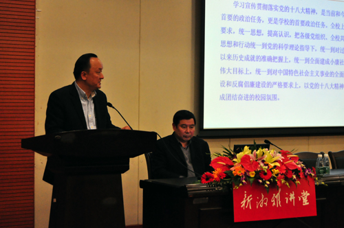 12月4日晚,湘雅三医院新湘雅讲堂在外科楼国际学术报告厅举行,中南大学党委书记高文兵传达了十八大精神,讲述了作为列席代表参加党的十八大的感受,介绍了大会盛况和大会主要精神,并就如何学习宣传贯彻党的十八大精神的提出指导性意见,要求湘雅三医院全体党员职工同志学习好、宣传好、贯彻好党的十八大精神。
