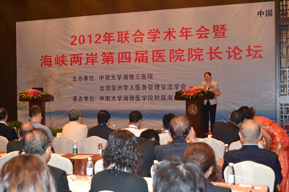 12月1—2日,由中南大学湘雅三医院、台湾亚洲华人医务管理交流学会联合主办的“海峡两岸第四届医院院长论坛”在海南省海口市人民医院召开。本次论坛,主要聚焦公立医院改革、两岸交流合作平台和全科医师培养模式。内容包括构建大陆与台湾医疗卫生管理经验交流平台,探索基层医疗机构体制改革;针对当前医疗资源配置现状,深化大陆与台湾医疗合作,提高卫生资源利用效率;拓宽联络渠道、建立健全长期合作机制。湘雅三医院党委书记罗爱静主持论坛开幕式,院长陈方平致开幕辞。
