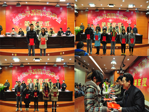 罗爱静宣读星语林奖学金获奖名单,在我院学习的本科生和硕士生共49名学子分获特等奖及一二三等奖,其中特等奖2名,一等奖6名,二等奖14名,三等奖27名。在主席台就座的嘉宾为获奖者颁奖。